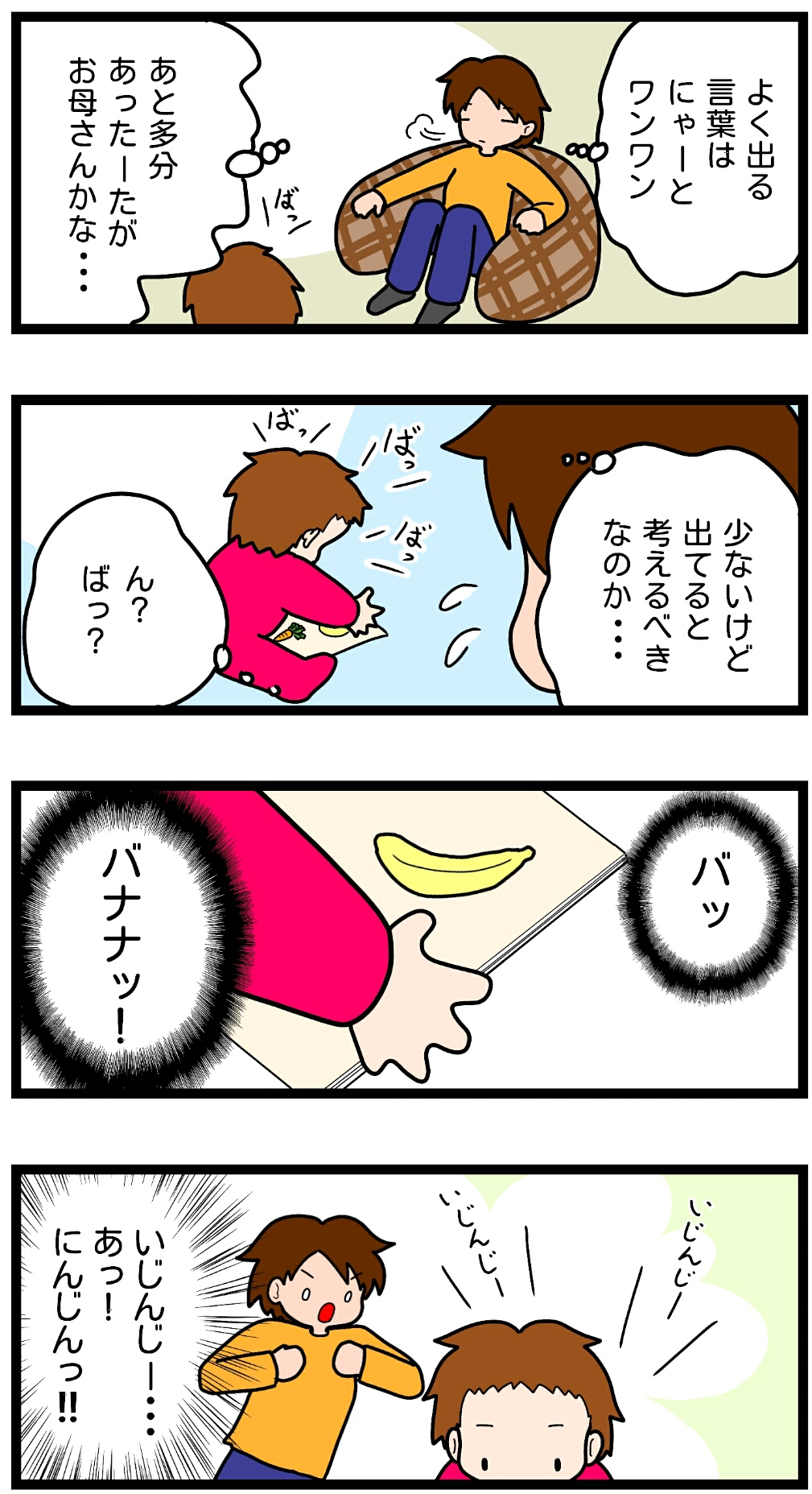 1語が出てきた!? 1歳8ヶ月 2018年10月31日 これはもしかしたら、自分の好きな食べ物だから言うようになったのかもしれないバナナと人参、大好きです(*´∇`*)この後からも、絵本の中にある野菜や果物の名前が出るようになり、これで どんどん言葉も出るようになるんじゃないかと期待しました 「1歳半~3歳」カテゴリの最新記事 タグ :#発達障害#自閉症#自閉症スペクトラム#1歳#女の子#ゆびさし#1語 < 前の記事次の記事 > コメント コメントフォーム 名前 コメント 評価する リセット リセット 顔 星 投稿する 情報を記憶