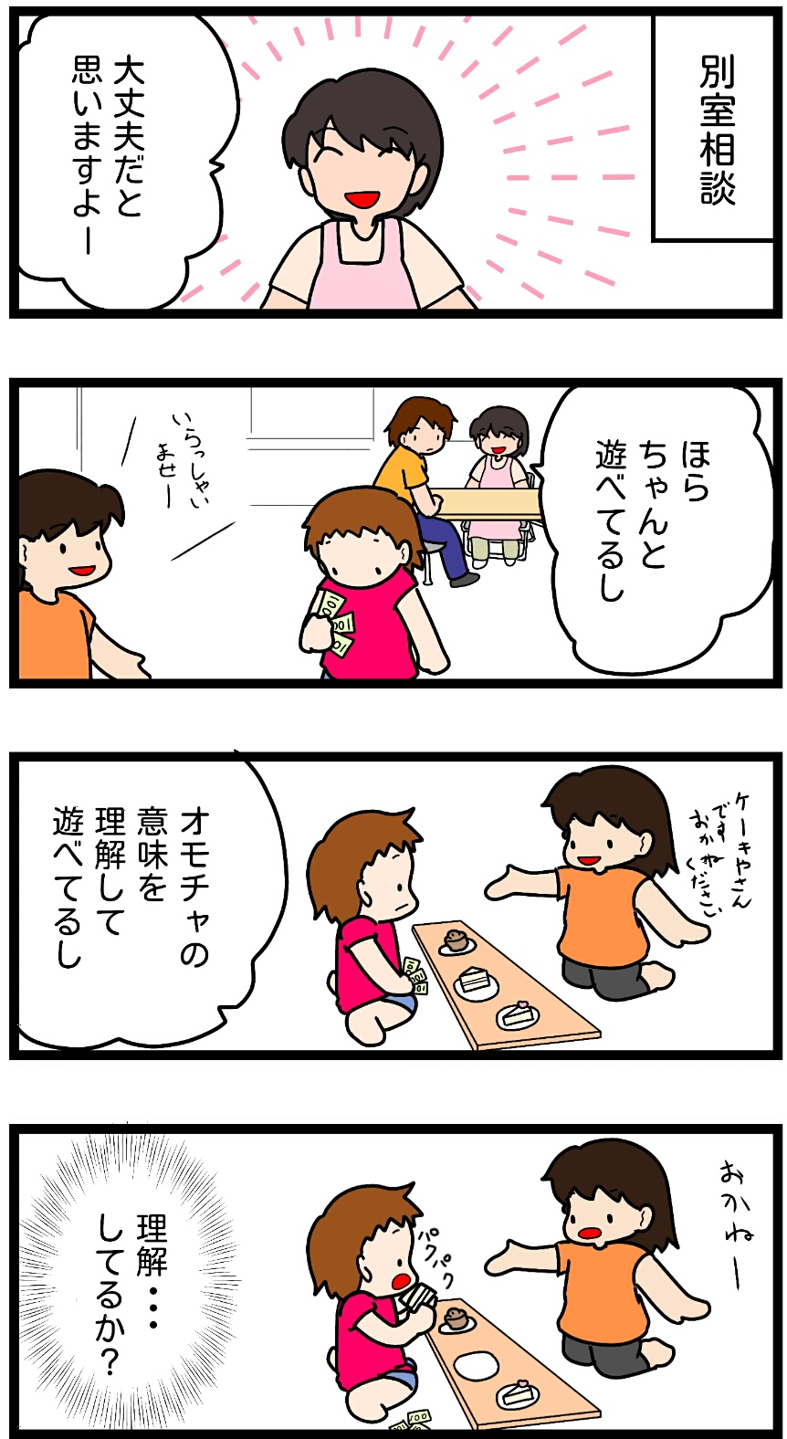 相談 3歳健診③ 2018年11月16日 相談室ではお店屋さんを作って紙のお金300円を渡され好きなおもちゃを買うと言う遊びを部屋全体でしていましたその一画で相談が行われていましたたしかに、ケーキのオモチャを取って食べる真似をするからオモチャの意味を理解してると言われればその通りなんですが…なんというか、間に居る人を見てない…それでもいいのか…?何がおかしいとかうまく説明できないしなんとなく不安なだけでは粘りようがないので、このまま帰りました…。 「3歳」カテゴリの最新記事 タグ :#発達障害#自閉症#自閉症スペクトラム#3歳#女の子#3歳健診#相談 < 前の記事次の記事 > コメント コメントフォーム 名前 コメント 評価する リセット リセット 顔 星 投稿する 情報を記憶