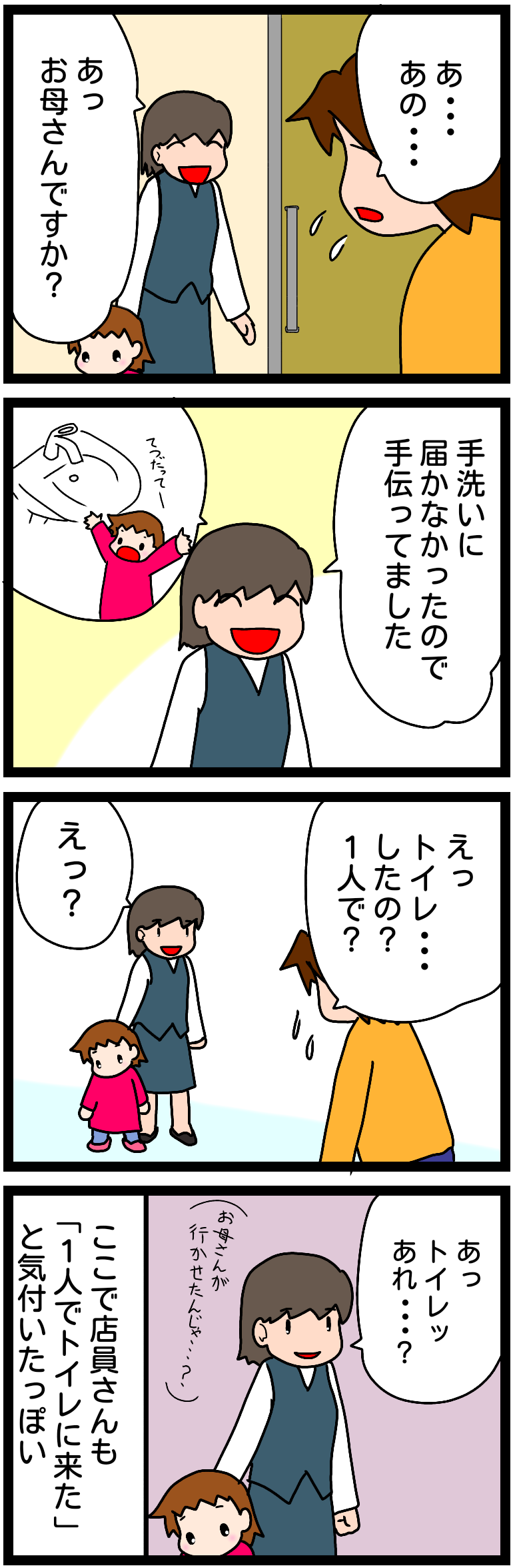 消えた娘④ 思いついて1人で行ったらしい (4歳10ヶ月) 2019年05月20日 続きです 消えた娘① 消えた娘② 消えた娘③なんとなく店員さんとかみ合わなくて私が焦っている様子を見て『あれ?』と思ったみたいです。店員さんには娘1人をトイレに行かせて買い物してる親に見えたかもしれない・・・続きますすくパラダブル総選挙 ブログ部門No.6アナタの1票がうれしい(*´▽`*)自閉症スペクトラムと診断されるまで最初の不安健診様子見を止めた日発達相談小児心理にほんブログ村気が向いた時にポチッとして下さい(・∀・) 「4歳後半」カテゴリの最新記事 タグ :#スーパー#トイレ#4歳#女の子#自閉症スペクトラム#自閉症#発達障害 < 前の記事次の記事 > コメント コメント一覧 (4) 4. さやこ 2019年05月20日 20:00 >>2 コメントありがとうございます😳 GPS!付けたいですね!わかります!(;´Д`) 本人も慣れた場所だからか そこまで怖がらないのが困りますね。 3. さやこ 2019年05月20日 19:55 >>1 ホントに足がガクガクしながら探しましたー!(>_<) 2. ともくんママ 2019年05月20日 17:07 はじめまして。いつもブログ拝見させていただいております。 うちの息子(4歳)も自閉傾向があり、保育園と療育に通って随分マシ(笑)になりましたが、外出先(慣れた場所)で勝手に1人で行動してしまうことがあり困っています。もし本当に迷子になってしまったら…とヒヤヒヤします。毎回「1人で行かないで。ママと会えなくなっちゃうよ。」と言ってますが、伝わってるのかどうなのか…。主人はGPS付けたいとか言ってます(笑) 1. ゆん 2019年05月20日 14:56 誘拐とかじゃなくて 良かったですー!>< 焦りますよね(^ω^;) コメントフォーム 名前 コメント 評価する リセット リセット 顔 星 投稿する 情報を記憶
