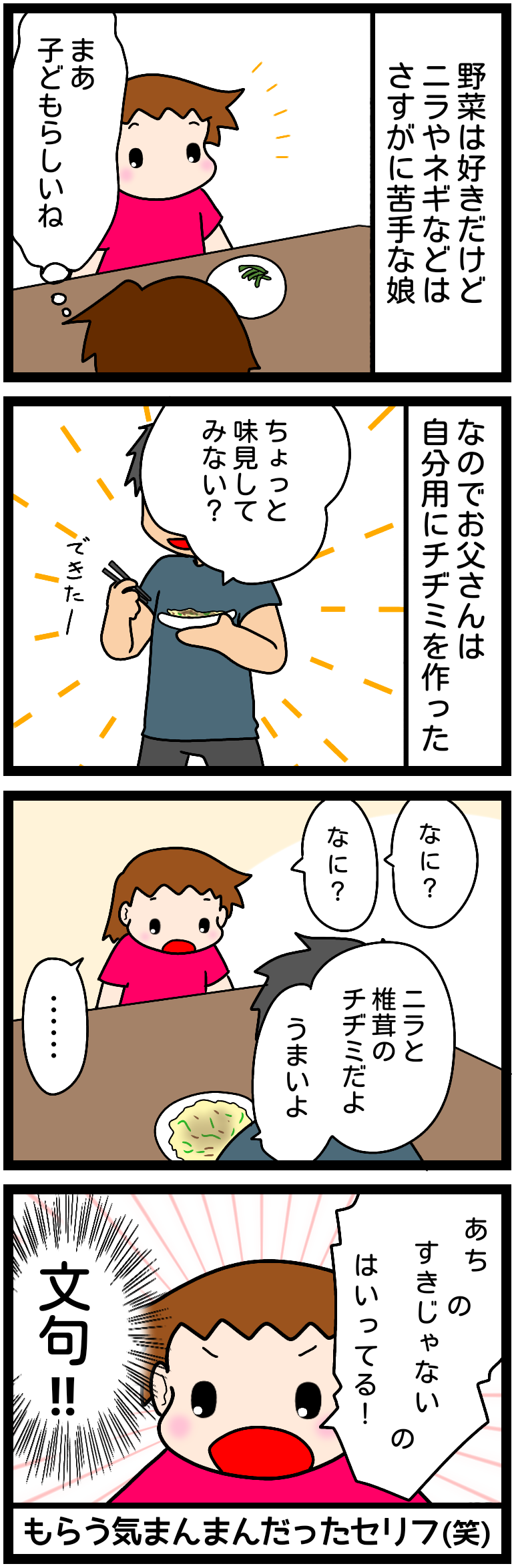 おいしそうだと思ったのに (4歳10ヶ月) 2019年06月03日 お父さんが食べてるものは分けてもらえると思ってます。でも自分が嫌いなものだったら文句言うとか(笑)お父さんも文句言われて喜んでるしね(^-^;現在、利き手を怪我して更新がゆっくりです。描けるんだけどちょっと小指と親指がつりそう(笑)すくパラダブル総選挙 ブログ部門No.6投票はこちらアナタの1票がうれしい(*´▽`*)自閉症スペクトラムと診断されるまで最初の不安健診様子見を止めた日発達相談小児心理にほんブログ村気が向いた時にポチッとして下さい(・∀・) 「4歳後半」カテゴリの最新記事 タグ :#ご飯#好き嫌い#ニラ#チヂミ#4歳#女の子#自閉症スペクトラム#発達障害 < 前の記事次の記事 > コメント コメントフォーム 名前 コメント 評価する リセット リセット 顔 星 投稿する 情報を記憶