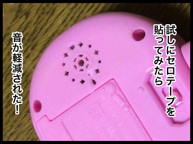 うちもおもちゃの音が大きすぎて、娘は聴覚過敏なので、同じく音が出るところに丸い(穴の大きさと同じか少し小さいくらいの)キャラクターシールを貼ってます。