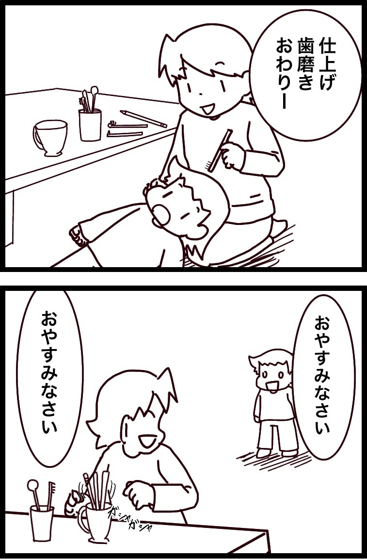 仕上げ歯磨きして、仕上げ前に軽く飲む用の水が入ったコップに